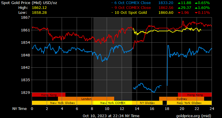 Trên thị trường vàng thế giới, giá vàng giao ngay chốt phiên hôm qua tại Mỹ giảm nhẹ 0,9 USD xuống 1.860 USD/ounce. Sang phiên châu Á sáng nay, giá vàng đi ngang và tạm đứng tại mức 1.860,3 USD/ounce.