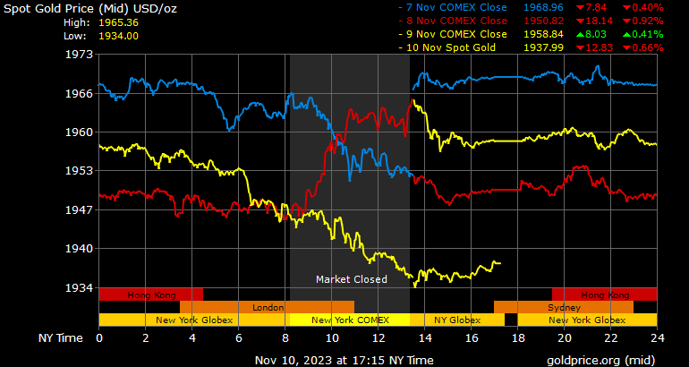 Giá vàng tương lai giao tháng 12/2023 trên sàn Comex New York giảm 32,1 USD, tương ứng giảm 1,63% xuống 1.937,7 USD/ounce.