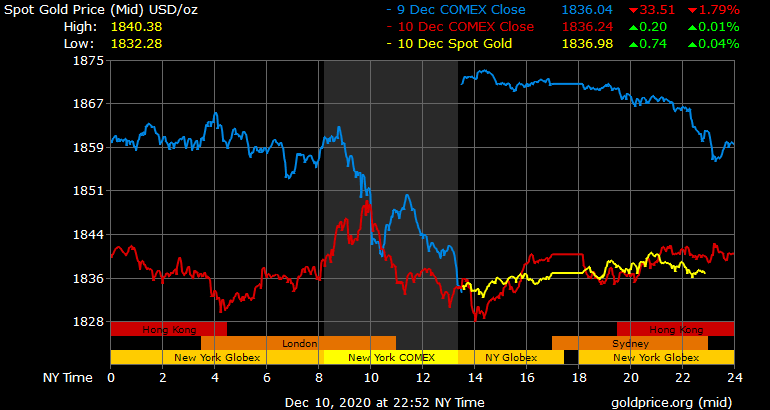 Giá vàng tương lai giao tháng 1/2021 trên sàn Comex New York tăng 2,8 USD lên 1.838 USD/ounce.