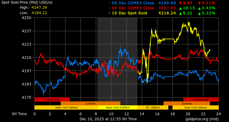 Trên thị trường vàng thế giới, giá vàng giao ngay chốt phiên hôm qua tại Mỹ tăng 20,9 USD, tương ứng tăng 0,5% lên mức 4.228,8 USD/ounce. Sang phiên châu Á sáng nay, giá vàng đảo chiều giảm 11,8 USD xuống 4.217 USD/ounce.