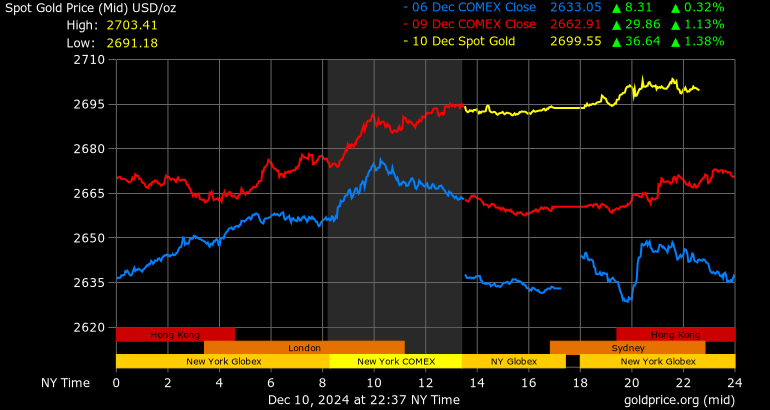 Trên thị trường vàng thế giới, giá vàng giao ngay chốt phiên hôm qua tại Mỹ tăng mạnh 33,6 USD lên 2.693,9 USD/ounce. Sang phiên châu Á sáng nay, giá vàng tiếp tục tăng 4,6 USD lên 2.698,5 USD/ounce.