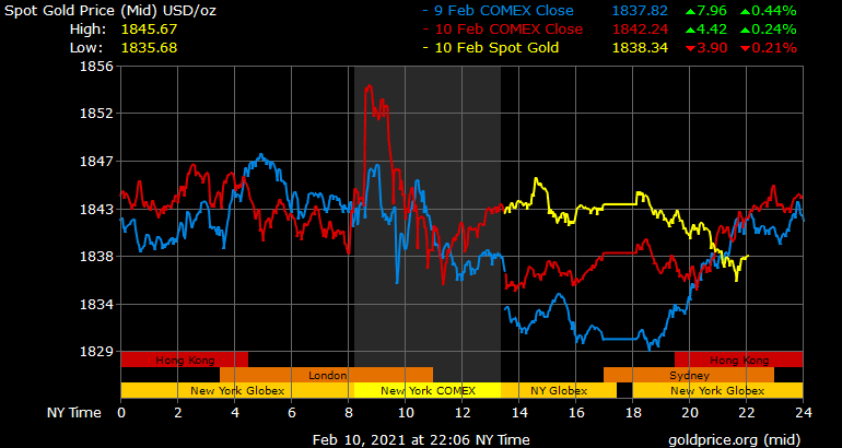 Trên thị trường vàng thế giới, giá vàng giao ngay chốt phiên đêm qua tại Mỹ tăng 5,9 USD lên 1.843,7 USD/ounce. Sang phiên châu Á sáng nay, giá vàng hạ nhiệt và lùi xuống dưới 1.840 USD/ounce.