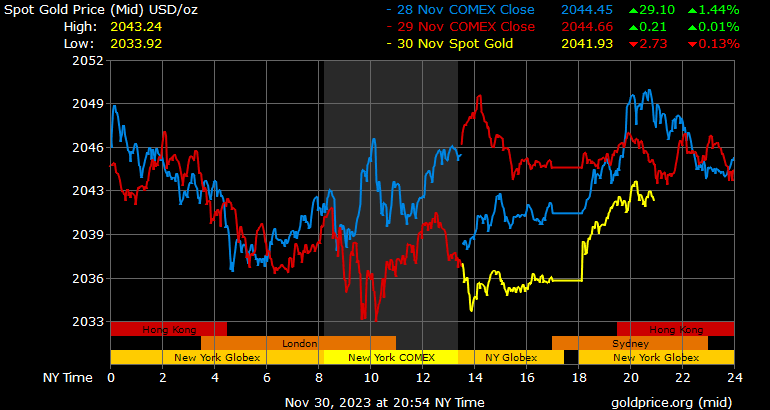 Giá vàng điều chỉnh nhẹ khi chỉ số đô la Mỹ phục hồi và giá dầu thô thấp hơn. Điều này đã khiến giá kim loại quý này không giữ được mức tăng trên 2.050 USD/ounce, nhưng kết thúc tháng 11 vẫn ở mức giá cao kỷ lục hàng tháng.