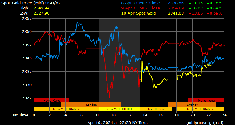 Giá vàng tương lai giao tháng 6/2024 trên sàn Comex New York giảm 14 USD, tương ứng giảm 0,59% xuống mức 2.348,4 USD/ounce.