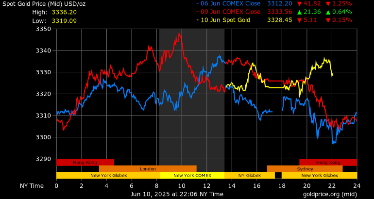 Giá vàng tương lai giao tháng 8/2025 trên sàn Comex New York giảm 11,5 USD, tương ứng giảm 0,34% xuống mức 3.343,4 USD/ounce.