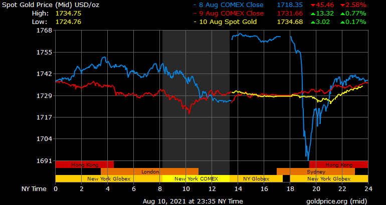 Giá vàng tương lai giao tháng 9 trên sàn Comex New York tăng 3,3 USD lên 1.732,3 USD/ounce.