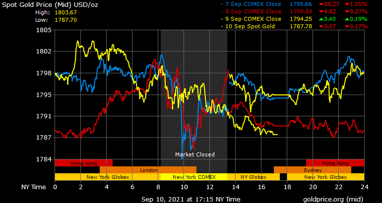 Trên thị trường vàng thế giới, giá vàng giao ngay chốt phiên đêm qua tại Mỹ giảm 7,4 USD xuống 1.786,8 USD/ounce. Giá vàng tương lai giao tháng 10 trên sàn Comex New York giảm 11,3 USD xuống lên 1.786,5 USD/ounce.