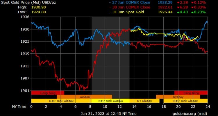 Giá vàng tương lai giao tháng 2/2023 trên sàn Comex New York tăng 6,6 USD lên 1.929,5 USD/ounce.