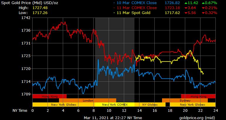 Giá vàng tương lai giao tháng 4 trên sàn Comex New York giảm 7,3 USD xuống 1.715,3 USD/ounce.