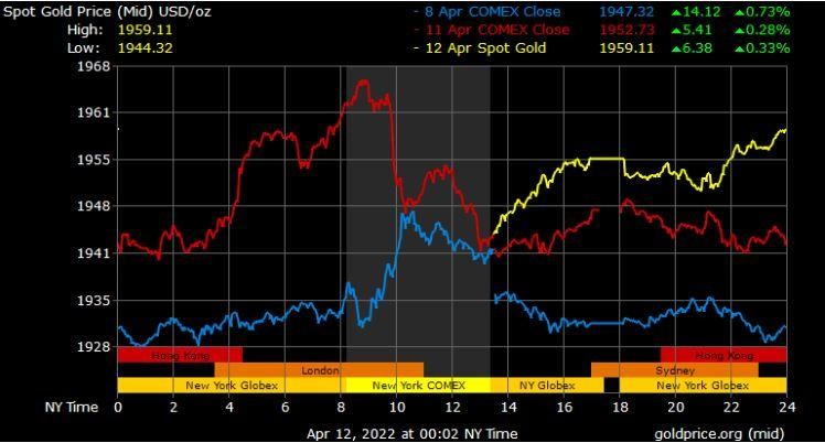 Giá vàng tương lai giao tháng 6/2022 trên sàn Comex New York tăng 2,6 USD lên 1.948,2 USD/ounce.