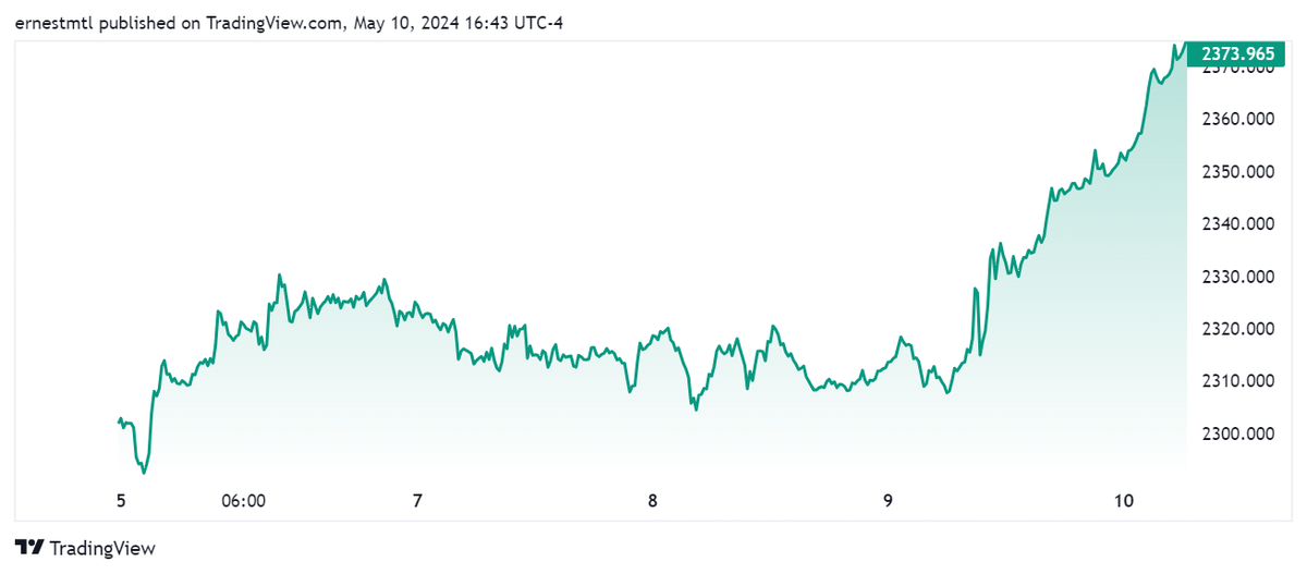 Giá vàng tương lai giao tháng 6/2024 trên sàn Comex New York tăng 34,7 USD, tương ứng tăng 1,48% lên mức 2.375 USD/ounce. Tính chung cả tuần, giá vàng giao ngay tăng 66,4 USD/ounce, tương ứng tăng 2,88%.