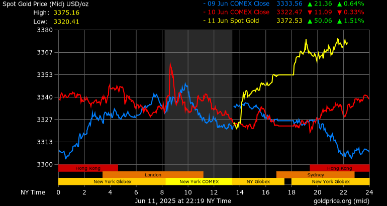 Giá vàng tương lai giao tháng 8/2025 trên sàn Comex New York tăng nhẹ 0,3 USD, tương ứng tăng 0,01% lên mức 3.343,7 USD/ounce.