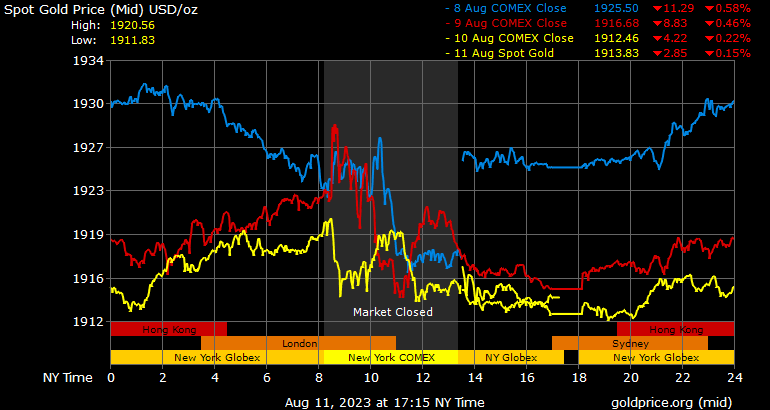 Trên thị trường vàng thế giới, giá vàng giao ngay chốt phiên cuối tuần tại Mỹ tăng nhẹ 1,3 USD lên 1.913,1 USD/ounce.