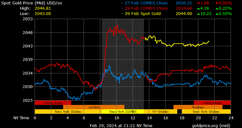 Giá vàng tương lai giao tháng 4/2024 trên sàn Comex New York tăng 12 USD, tương ứng tăng 0,59% xuống mức 2.054,7 USD/ounce.