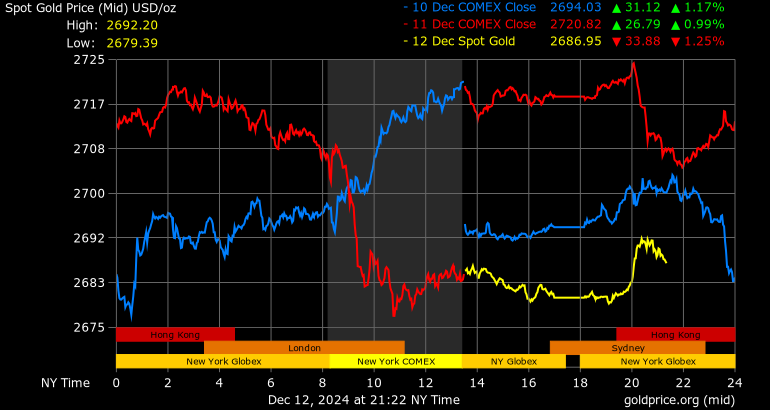 Giá vàng tương lai giao tháng 2/2025 trên sàn Comex New York giảm mạnh 47,3 USD, tương ứng giảm 1,72% xuống mức 2.709,4 USD/ounce.