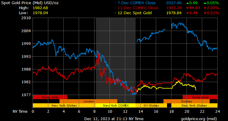 Giá vàng tương lai giao tháng 2/2024 trên sàn Comex New York giảm nhẹ 0,5 USD, tương ứng giảm 0,03% xuống 1.993,2 USD/ounce.
