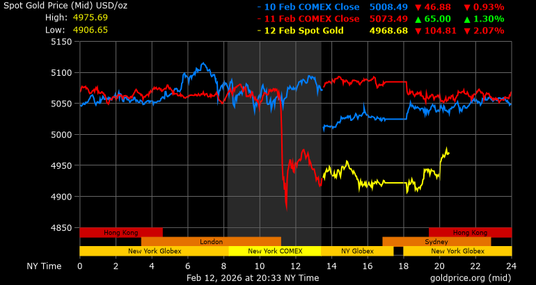 Trên thị trường vàng thế giới, giá vàng giao ngay chốt phiên hôm qua tại Mỹ giảm mạnh 162,2 USD, tương ứng giảm 3,19% xuống mức 4.922,1 USD/ounce. Sang phiên châu Á sáng nay, giá vàng đảo chiều tăng 47,3 USD lên mức 4.969,4 USD/ounce.