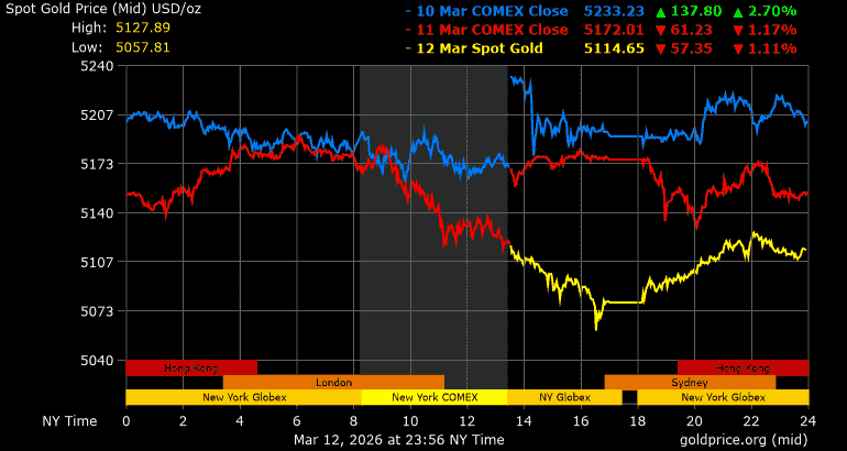 Trên thị trường vàng thế giới, giá vàng giao ngay chốt phiên hôm qua tại Mỹ giảm 97,2 USD, tương ứng giảm 1,88% xuống mức 5.079,3 USD/ounce. Sang phiên châu Á sáng nay, giá vàng đảo chiều tăng 35,6 USD lên mức 5.114,9 USD/ounce.