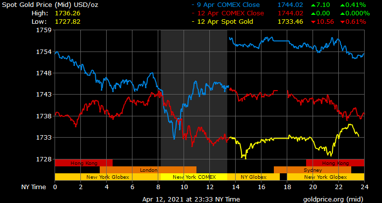 Giá vàng tương lai giao tháng 5 trên sàn Comex New York tăng 1,5 USD lên 1.733,1 USD/ounce.