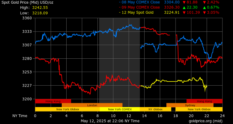 Giá vàng tương lai giao tháng 6/2025 trên sàn Comex New York giảm mạnh 116 USD, tương ứng giảm 3,47% xuống mức 3.228 USD/ounce.