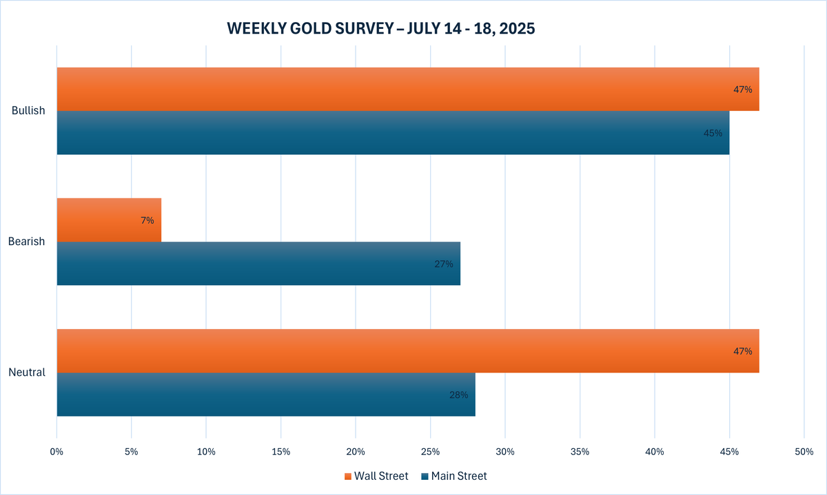 Tuần này, 15 nhà phân tích đã tham gia Khảo sát Vàng của Kitco News, với tất cả, trừ một chuyên gia Phố Wall, đều từ bỏ quan điểm bi quan. Bảy chuyên gia, tương đương 47%, hiện dự đoán giá vàng sẽ tăng trong tuần tới, trong khi một nhà phân tích duy nhất, chiếm 7%, dự đoán giá sẽ giảm. Bảy nhà phân tích còn lại, tương đương 47%, dự đoán giá vàng sẽ đi ngang vào tuần tới.