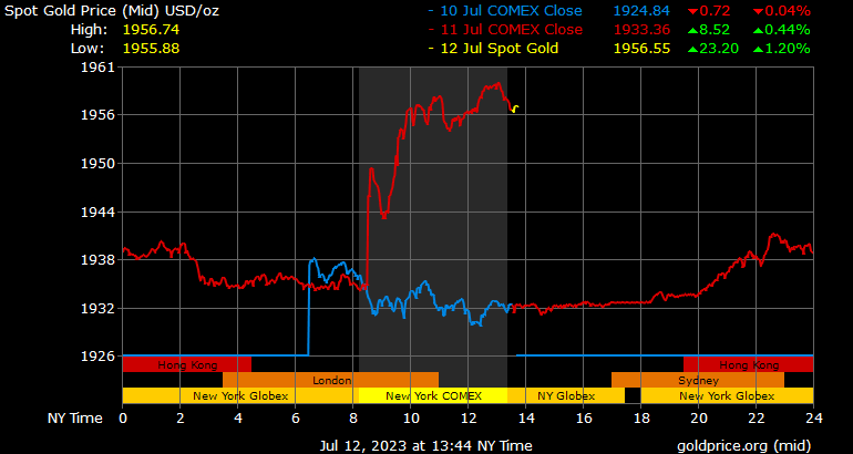 Giá vàng tương lai giao tháng 8/2023 trên sàn Comex New York tăng 24,6 USD, tương ứng tăng 1,27% lên 1.961,7 USD/ounce.