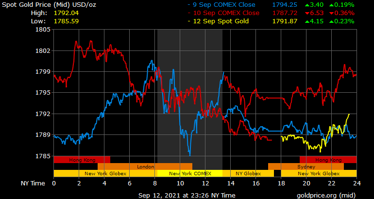 Trên thị trường vàng thế giới, giá vàng giao ngay chốt phiên cuối tuần qua tại Mỹ giảm 7,4 USD xuống 1.786,8 USD/ounce. Sang phiên châu Á sáng nay, giá vàng nhích nhẹ lên trên 1.791 USD/ounce.