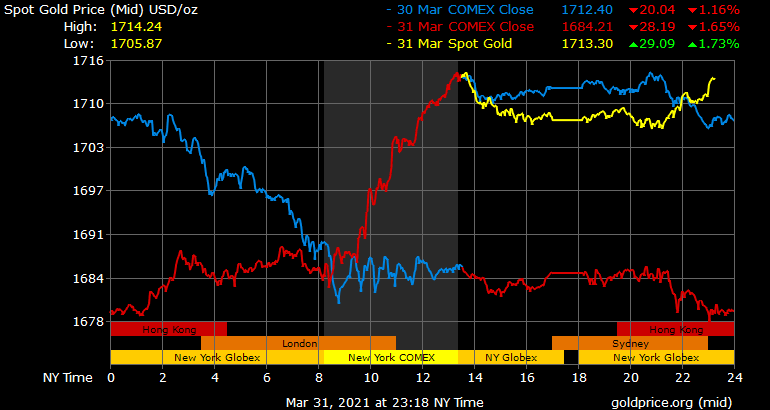 Giá vàng tương lai giao tháng 5 trên sàn Comex New York giảm 1,5 USD xuống 1.712,9 USD/ounce.