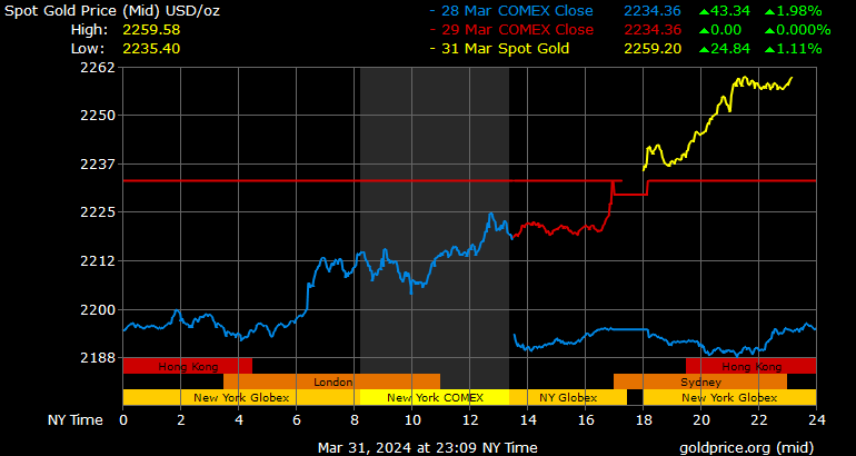 Trên thị trường vàng thế giới, giá vàng giao ngay chốt phiên cuối tuần qua tại Mỹ tăng 38,3 USD lên 2.233,1 USD/ounce. Sang phiên châu Á sáng nay, giá vàng tăng 24,6 USD lên 2.257,7 USD/ounce.