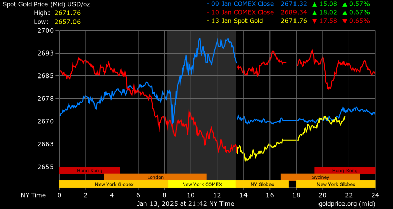 Giá vàng tương lai giao tháng 2/2025 trên sàn Comex New York giảm 36,4 USD, tương ứng giảm 1,34% xuống mức 2.678,6 USD/ounce.