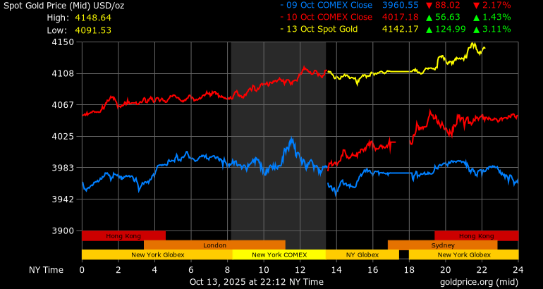 Giá vàng tương lai giao tháng 12/2025 trên sàn Comex New York tăng mạnh 132,6 USD, tương ứng tăng 3,31% lên mức 4.133 USD/ounce.