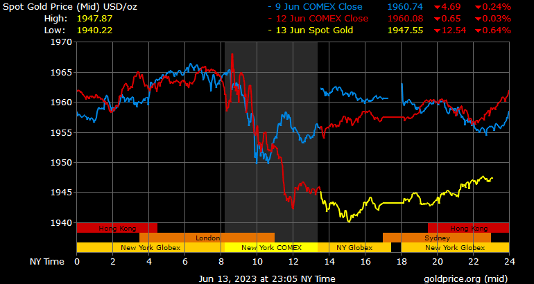 Giá vàng tương lai giao tháng 8/2023 trên sàn Comex New York giảm 11,1 USD, tương ứng giảm 0,56% lên 1.958,6 USD/ounce.