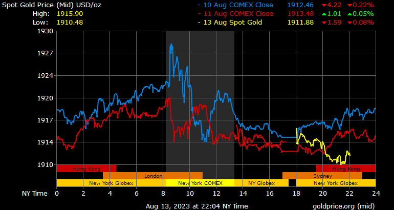 Trên thị trường vàng thế giới, giá vàng giao ngay chốt phiên hôm qua tại Mỹ tăng 1,3 lên 1.913,1 USD/ounce. Sang phiên châu Á sáng nay, giá vàng tiếp tục điều chỉnh nhẹ xuống mức 1.911,2 USD/ounce.