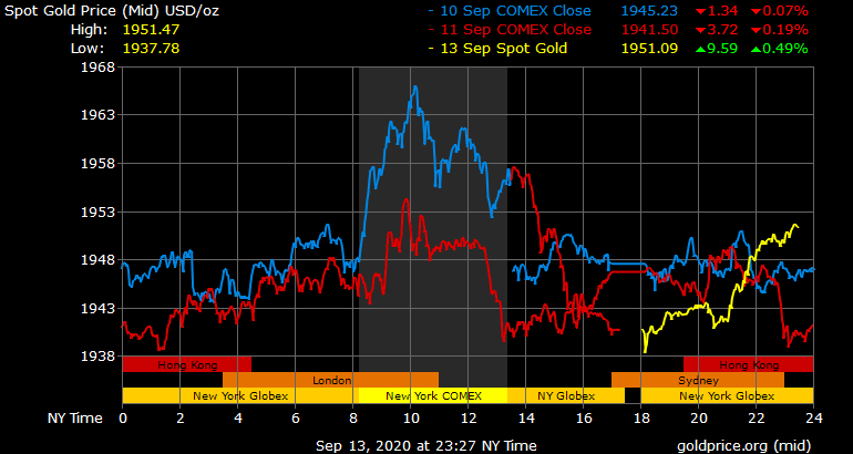 Trên thị trường vàng thế giới, giá vàng giao ngay chốt phiên cuối tuần qua tại Mỹ giảm 6,5 USD xuống 1.940,1 USD/ounce. Sang phiên châu Á sáng nay, giá vàng hồi phục và tăng khá nhanh lên trên ngưỡng 1.950 USD/ounce. Giá vàng tương lai giao tháng 10 trên sàn Comex New York tăng 11,9 USD lên 1.951,9 USD/ounce.