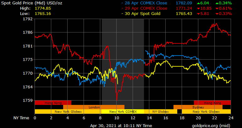 Trên thị trường vàng thế giới, giá vàng giao ngay chốt phiên ngày thứ Năm tại Mỹ giảm 4,1 USD xuống 1.776,9 USD/ounce. Sang phiên châu Á sáng nay, giá vàng gần như chỉ biến động giằng co nhẹ quanh ngưỡng trên cho đến cuối ngày.