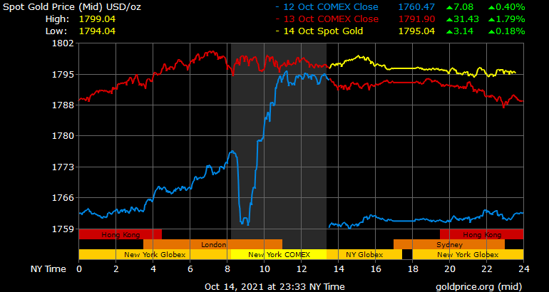 Trên thị trường vàng thế giới, giá vàng giao ngay chốt phiên đêm qua tại Mỹ tăng 3,3 USD lên 1.796,1 USD/ounce. Sang phiên châu Á sáng nay, giá vàng chững lại và đi ngang quanh 1.795 USD/ounce.