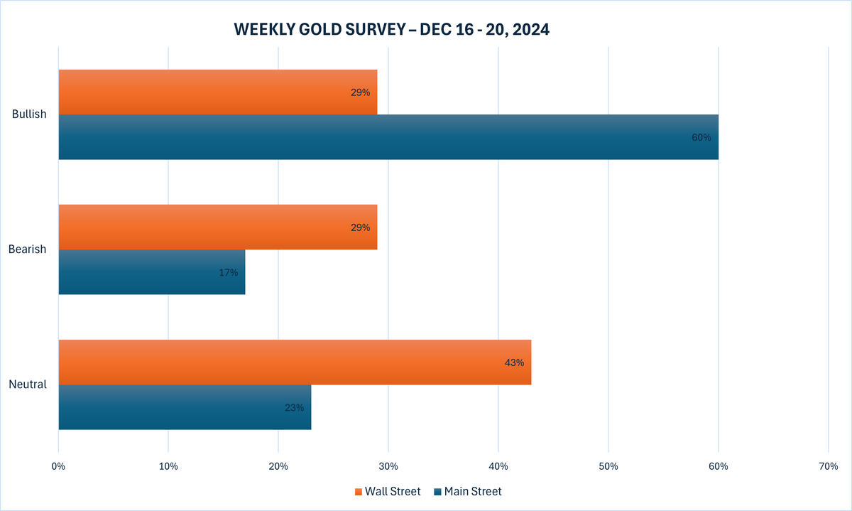 Tuần này, 14 nhà phân tích đã tham gia Khảo sát vàng của Kitco News, với tâm lý Phố Wall hiện chia đều giữa những người lạc quan và bi quan về giá và nhiều người chọn đứng ngoài cuộc. Bốn chuyên gia, hay 29%, dự kiến ​​giá vàng sẽ tăng trong tuần tới, trong khi bốn chuyên gia khác dự đoán giá sẽ giảm. Sáu chuyên gia, chiếm 43% tổng số, dự kiến ​​giá vàng sẽ vẫn dao động trong phạm vi hoặc chọn cách tiếp cận chờ đợi và quan sát.