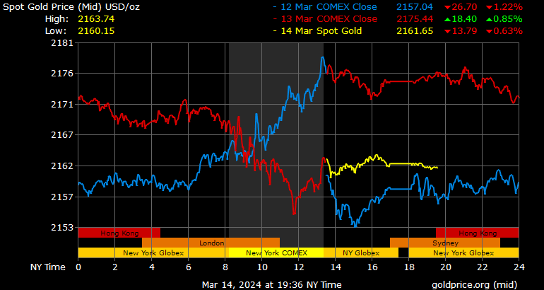 Giá vàng tương lai giao tháng 4/2024 trên sàn Comex New York giảm 13,3 USD, tương ứng giảm 0,61% xuống mức 2.167,5 USD/ounce.