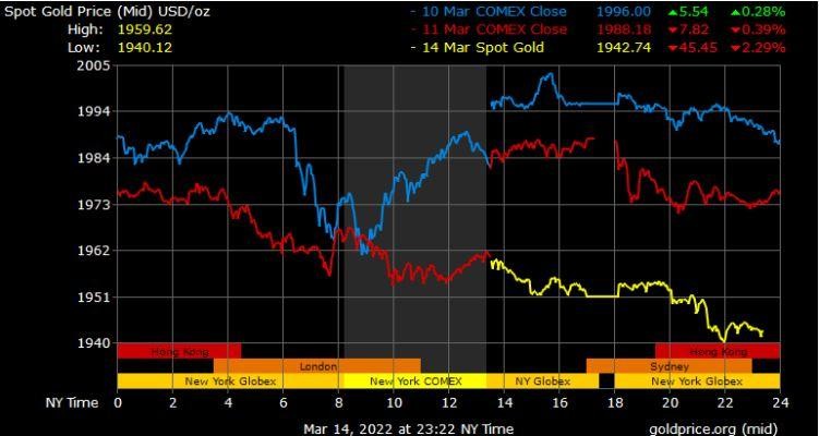 Giá vàng tương lai giao tháng 4/2022 trên sàn Comex New York giảm 24,2 USD xuống 1.960,8 USD/ounce
