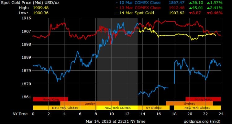 Giá vàng tương lai giao tháng 4/2023 trên sàn Comex New York giảm 5,6 USD xuống mức 1.910,9 USD/ounce.