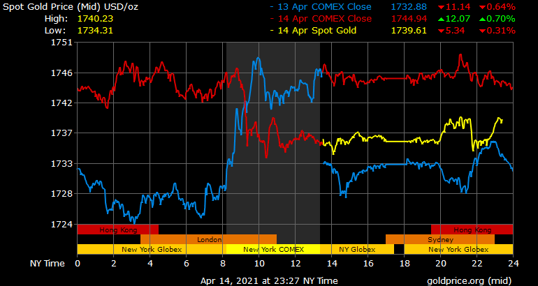 Giá vàng tương lai giao tháng 5 trên sàn Comex New York tăng 2,2 USD lên 1.737,5 USD/ounce.