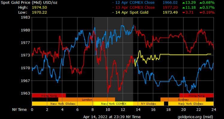 Giá vàng tương lai giao tháng 6/2022 trên sàn Comex New York giảm 9,8 USD xuống 1.974,9 USD/ounce.