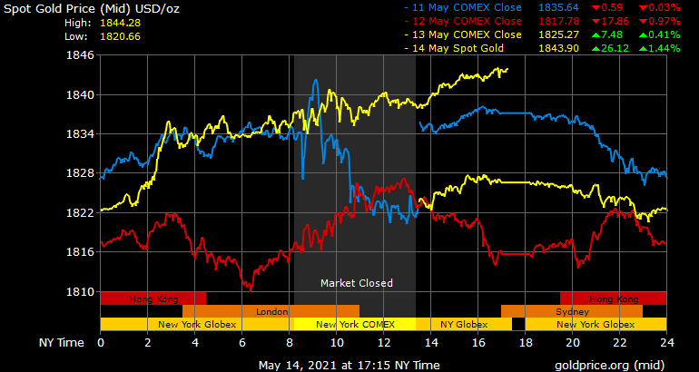 Trên thị trường vàng thế giới, giá vàng giao ngay chốt phiên đêm qua tại Mỹ tăng 17,4 USD lên 1.843,9 USD/ounce. Giá vàng tương lai giao tháng 6 trên sàn Comex New York tăng 20 USD lên 1.844 USD/ounce.