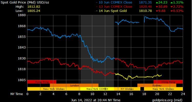 Giá vàng tương lai giao tháng 8/2022 trên sàn Comex New York giảm 18,3 USD xuống mức 1.813,5 USD/ounce.