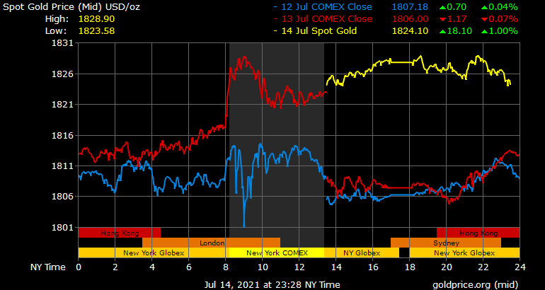 Trên thị trường vàng thế giới, giá vàng giao ngay chốt phiên đêm qua tại Mỹ tăng 20 USD lên 1.827,3 USD/ounce. Sang phiên châu Á sáng nay, giá vàng hạ nhiệt nhẹ về dưới 1.825 USD/ounce.