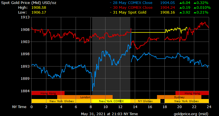 Giá vàng tương lai giao tháng 7 trên sàn Comex New York tăng 8,5 USD lên 1.912,5 USD/ounce.