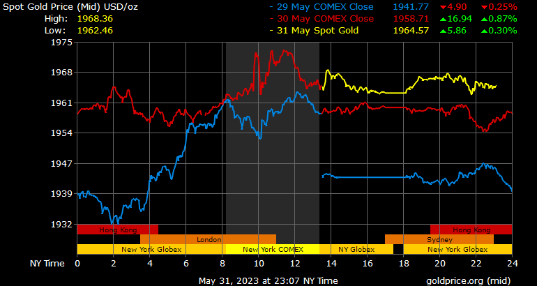 Trên thị trường vàng thế giới, giá vàng giao ngay chốt phiên hôm qua tại Mỹ tăng 3,1 USD lên 1.962,4 USD/ounce. Sang phiên châu Á sáng nay, giá vàng tiếp tục nhích nhẹ lên mức 1.964,8 USD/ounce.