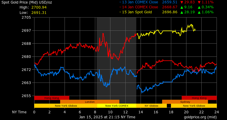 Trên thị trường vàng thế giới, giá vàng giao ngay chốt phiên hôm qua tại Mỹ tăng 18,8 USD lên 2.696,3 USD/ounce. Sang phiên châu Á sáng nay, giá vàng tiếp tục tăng nhẹ 0,7 USD lên 2.697 USD/ounce.