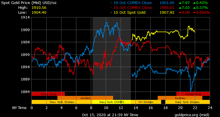 Trên thị trường vàng thế giới, giá vàng giao ngay chốt phiên đêm qua tại Mỹ tăng 8,4 USD lên 1.909,6 USD/ounce. Sang phiên châu Á sáng nay, giá vàng nhích nhẹ không đáng kể. Giá vàng tương lai giao tháng 11 trên sàn Comex New York tăng 4,6 USD lên 1.909,5USD/ounce.
