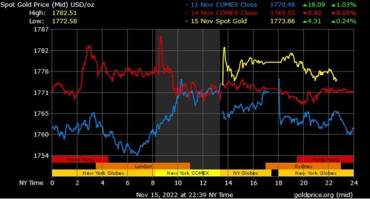 Giá vàng tương lai giao tháng 12/2022 trên sàn Comex New York giảm nhẹ 0,1 USD xuống mức 1.776,8 USD/ounce.